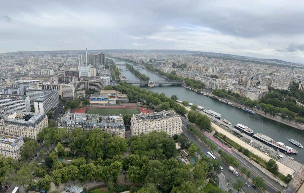 We were rewarded with a great view at the top. I could see Basilique du Sacré-Cœur de Montmartre on a distant hill (about 3 miles from here). The river bends 180•, with the tower in the center of the bend.