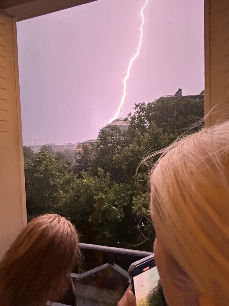 The weather was 92 degrees today and there had been warnings of thunderstorms off and on. As we headed to bed a huge storm moved in. Thunder and lightning, high winds blowing over all the cafe umbrellas. We stood on our balcony for a long time watching Parisianers run for cover as a river of storm water charted a path down the street below.
