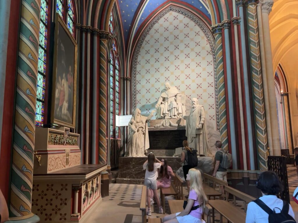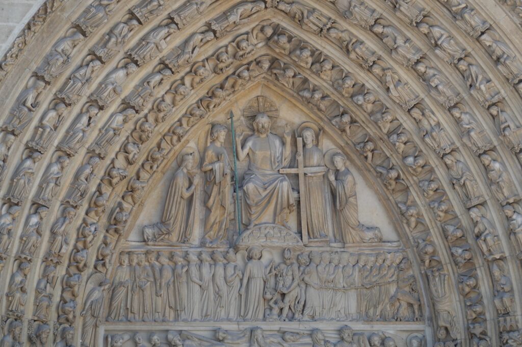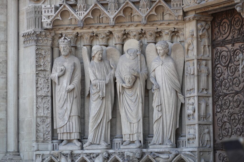 The “no ticket” line snaked around a long way in the hot sun, but thankfully our line was really quick. Outside were many elaborate sculptures decorating the front of the cathedral. The guy third from the left, below, is St Denis who brought Christianity to Paris (and was beheaded for it):