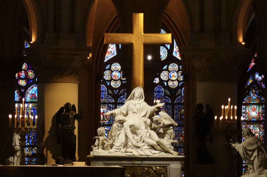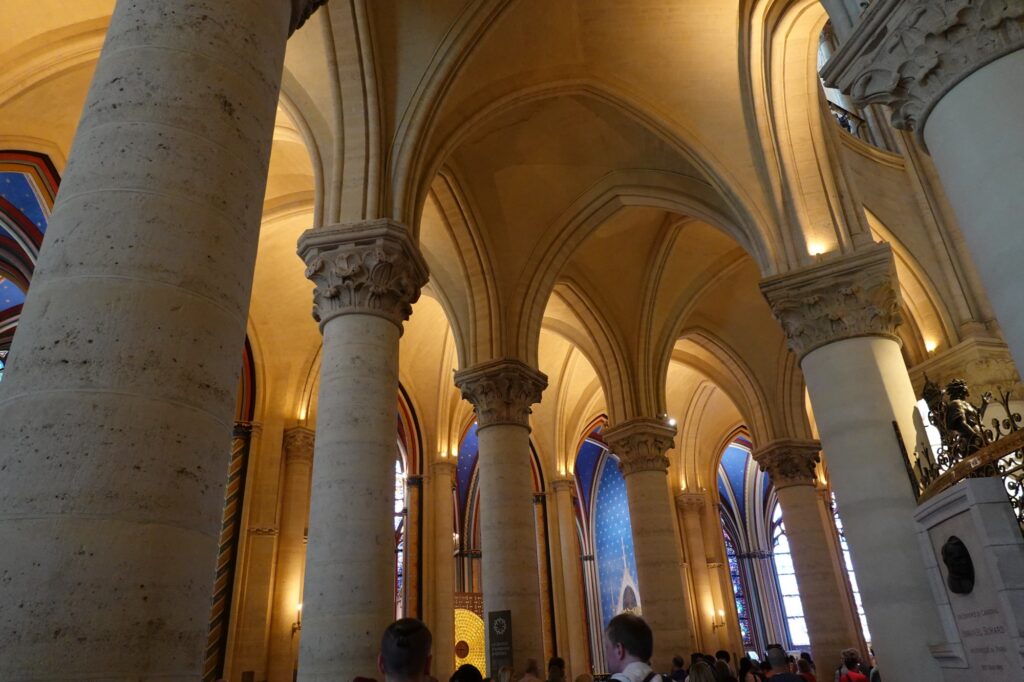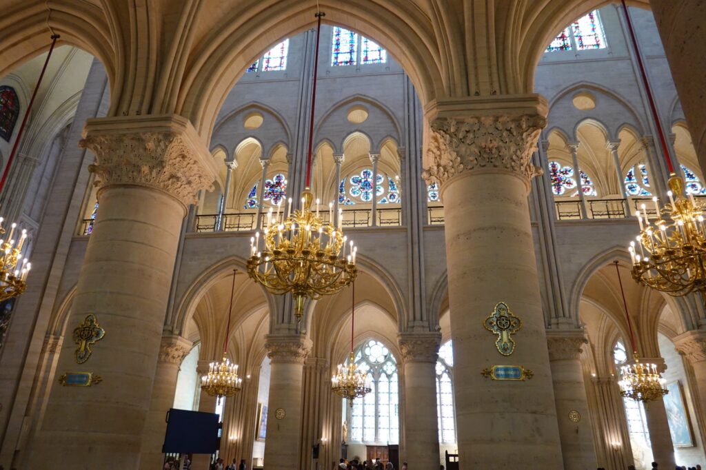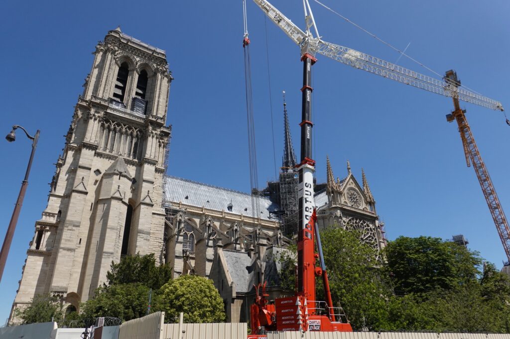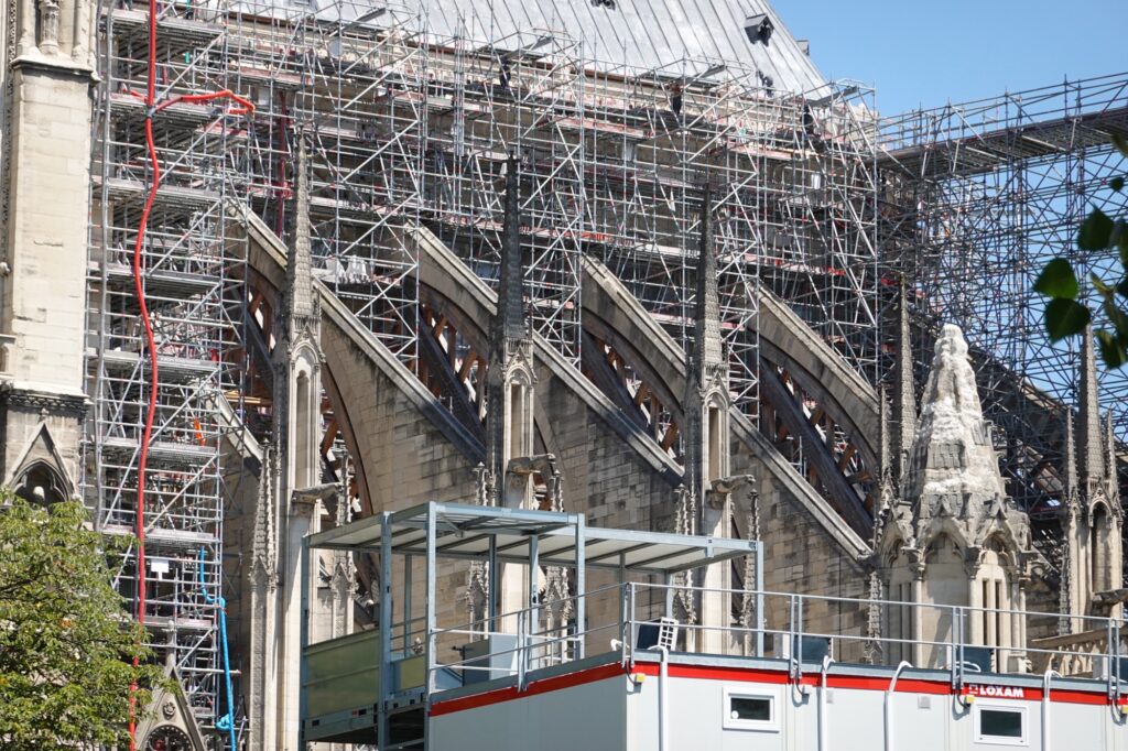 There were no signs of any fire damage at all inside. But once back outside, we walked around and you could spot the charred stone amidst all the scaffolding. Cranes were busy at work continuing the repairs from the fire 6 years ago.